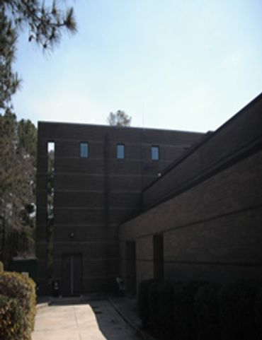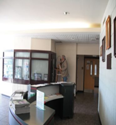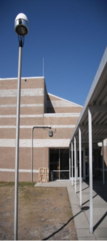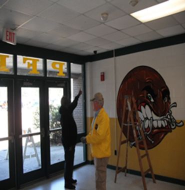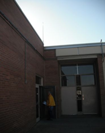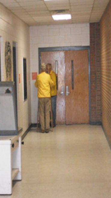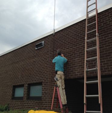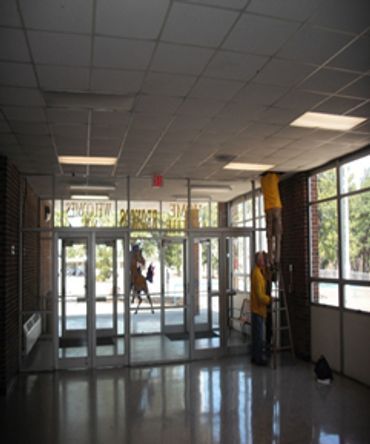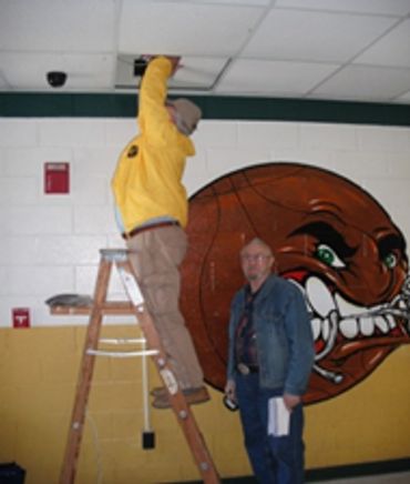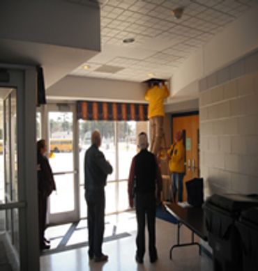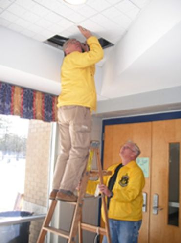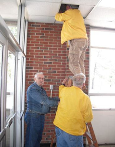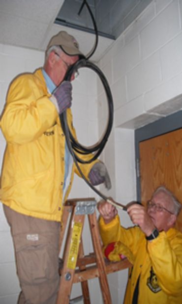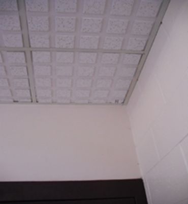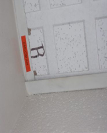 The cable is stored in the drop ceiling next to a ceiling tile marked with a red R.